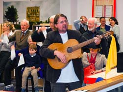 und feierliche Ankunft der Gießener Reisegesellschaft mit Eröffnung des Reisebüros „Muss i denn Tours & Cargo Trips“ durch Reiseleiterin Esther Steinbrecher (Berlin) und Reisemusiker Klaus Seifert (Odenwald).
