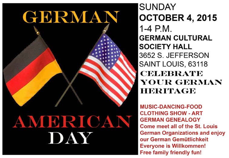 Celebrate your German Heritage! On SUNDAY afternoon from 1:00 p.m. until 4:00 p.m. on OCTOBER 4TH, 2015 the St. Louis German American Committee will celebrate Germany American Day at