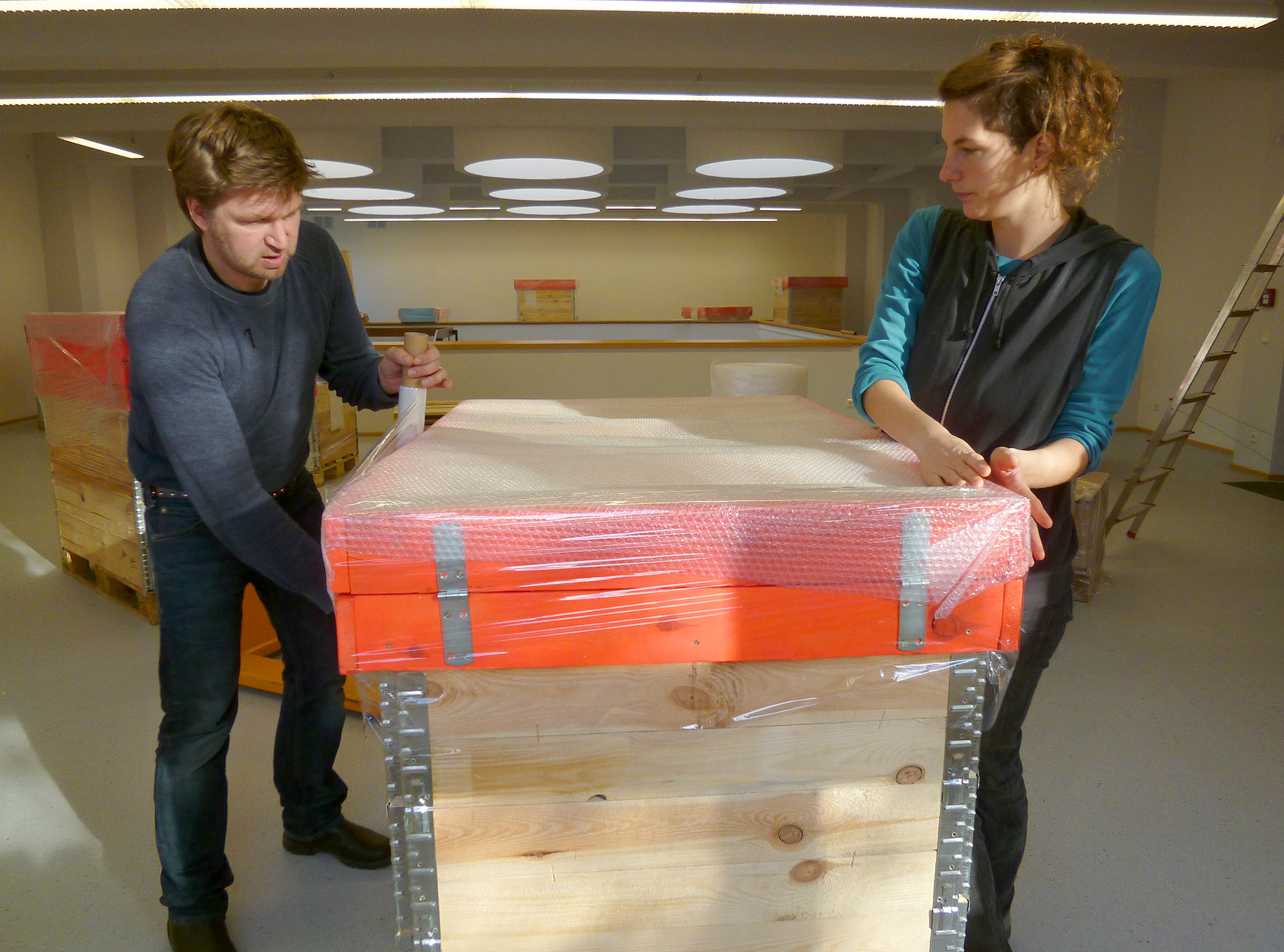 The exhibit Utopia has a narrative space at its center with the public Archive and Utopia Library.image Exhibits are surrounding this “knowledge core” within a second circle: video installations, audio stations, text panels, large photographs, historical objects unfold the story further. Events form the third circle, the outer space. Transport and expedition boxes are the universal design element and have multifunctional usage.
